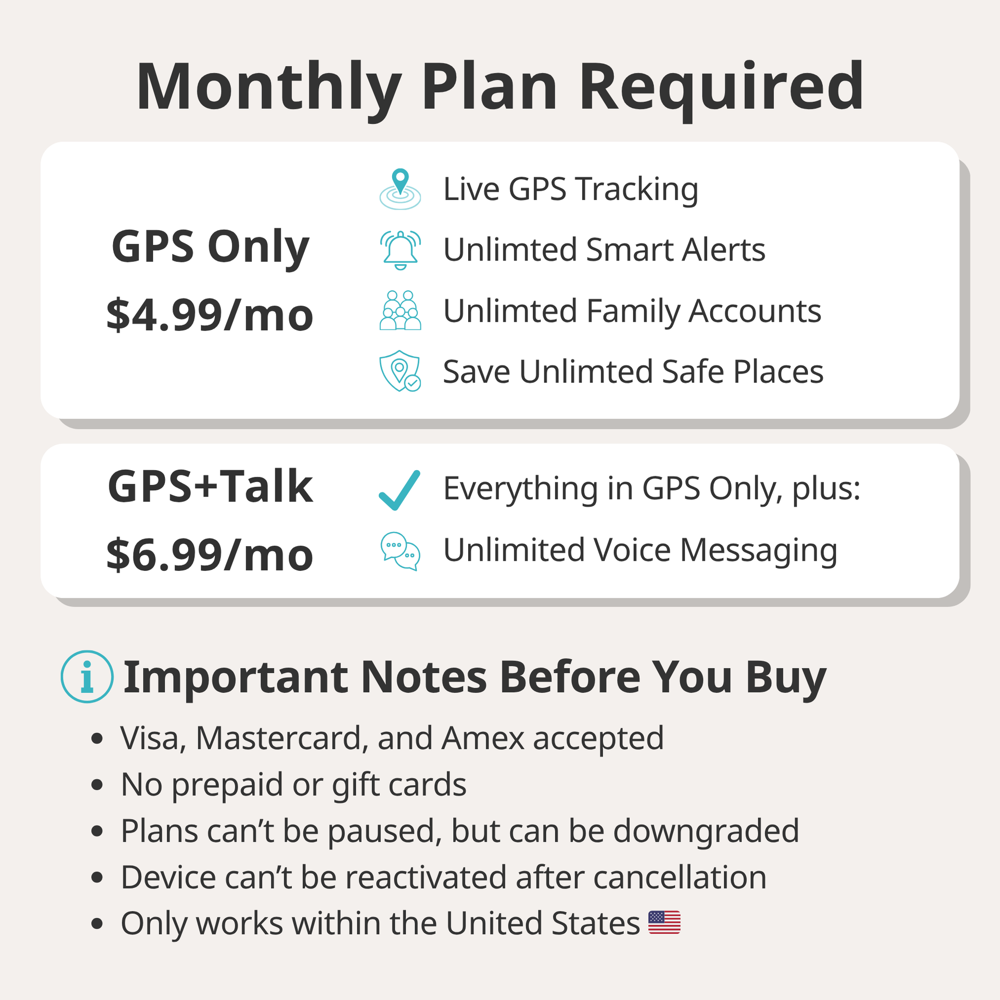 An active plan is required for the device to operate. If the plan is canceled, the device will not function until service is reactivated. Coverage and location updates may vary depending on signal and movement.